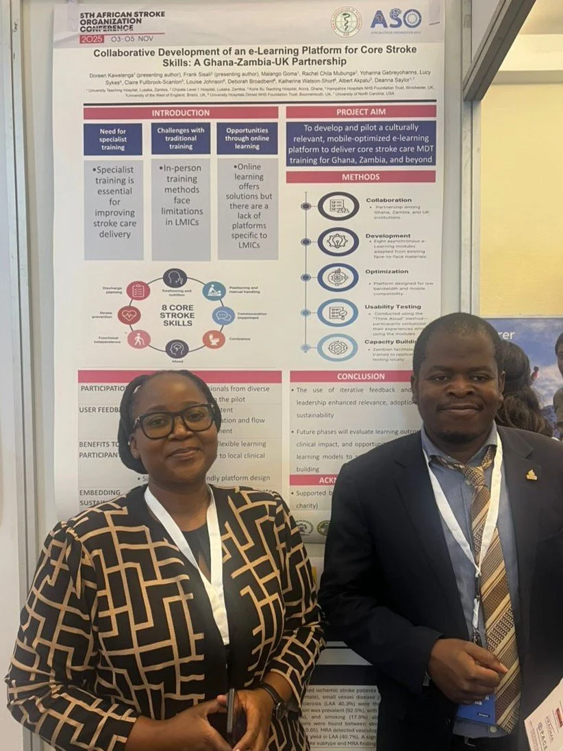 Physiotherapists Doreen and Frank (Zambia) presented a poster on behalf of the Zambian, Ghanaian, and UK teams at the African Stroke Organization Conference in Nairobi 3-5 November. Prof Deanna Saylor delivered the B O Osuntokun lecture on Improving Stroke Care in Zambia.